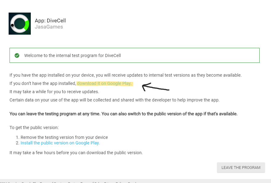 - Nachdem du de Gruppe beigeteten bist kannst du mit diesm Link dem Geschlossenen Test beitreten https://play.google.com/store/apps/details?id=de.jasagames.DiveCell klicke dafür auf den gelb markierten Link: