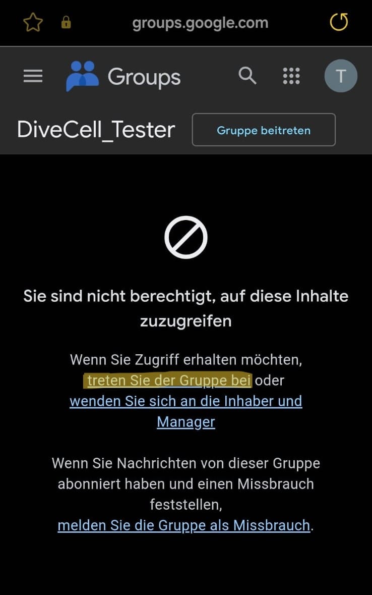https://groups.google.com/g/divecell_tester klicke dazu auf den im Bild gelb markierten Link oder auf den Button oben Rechts: